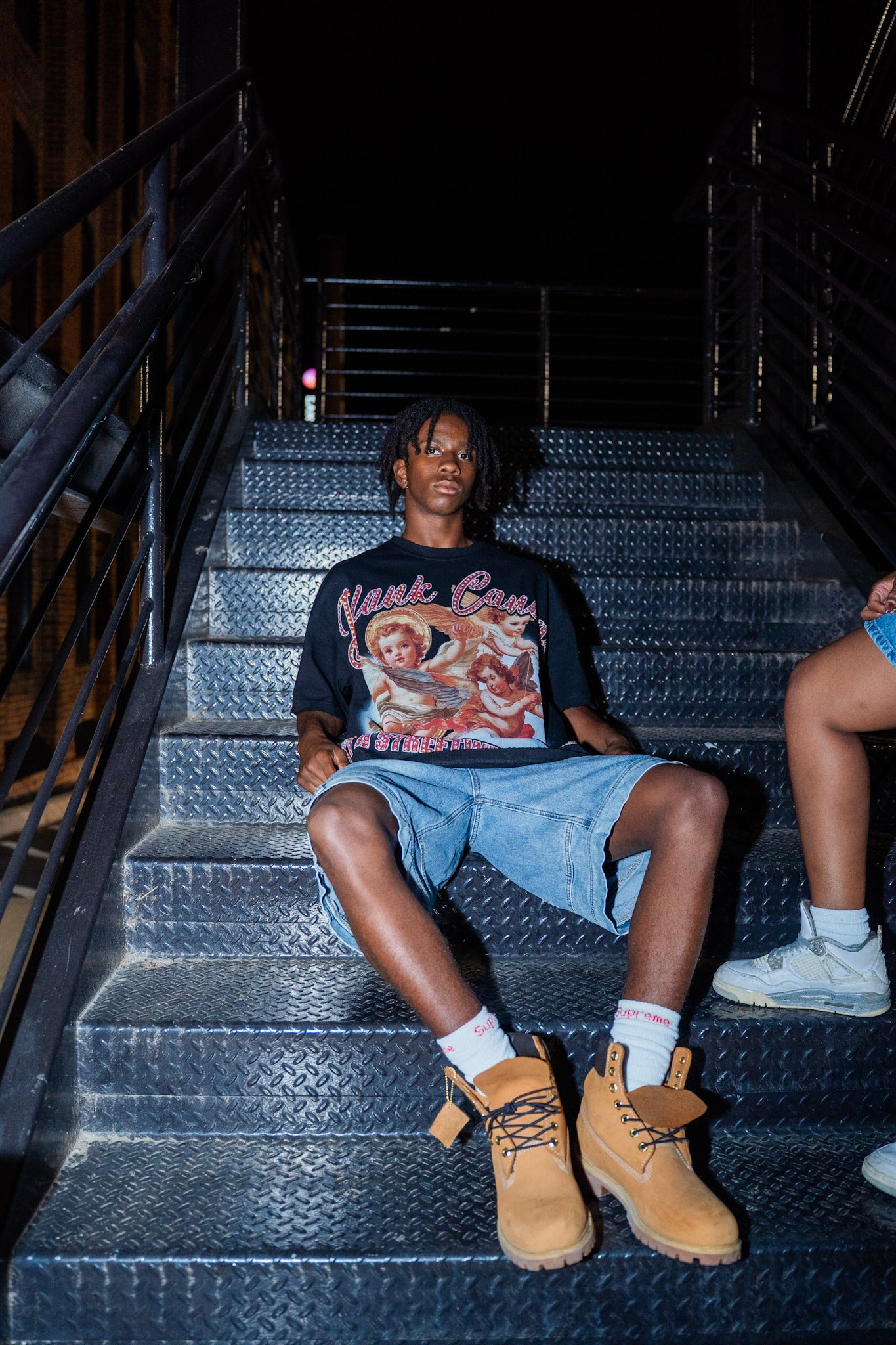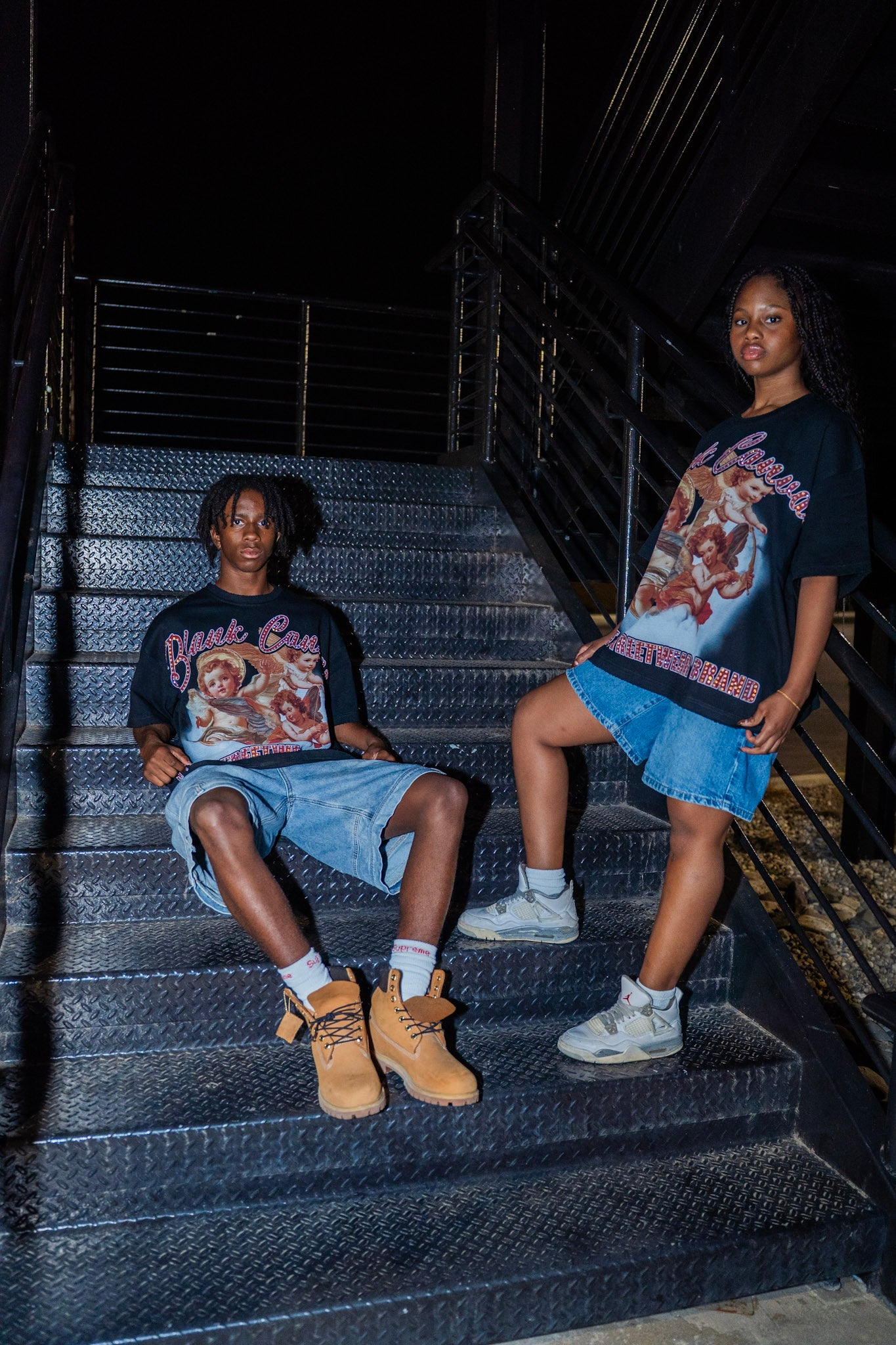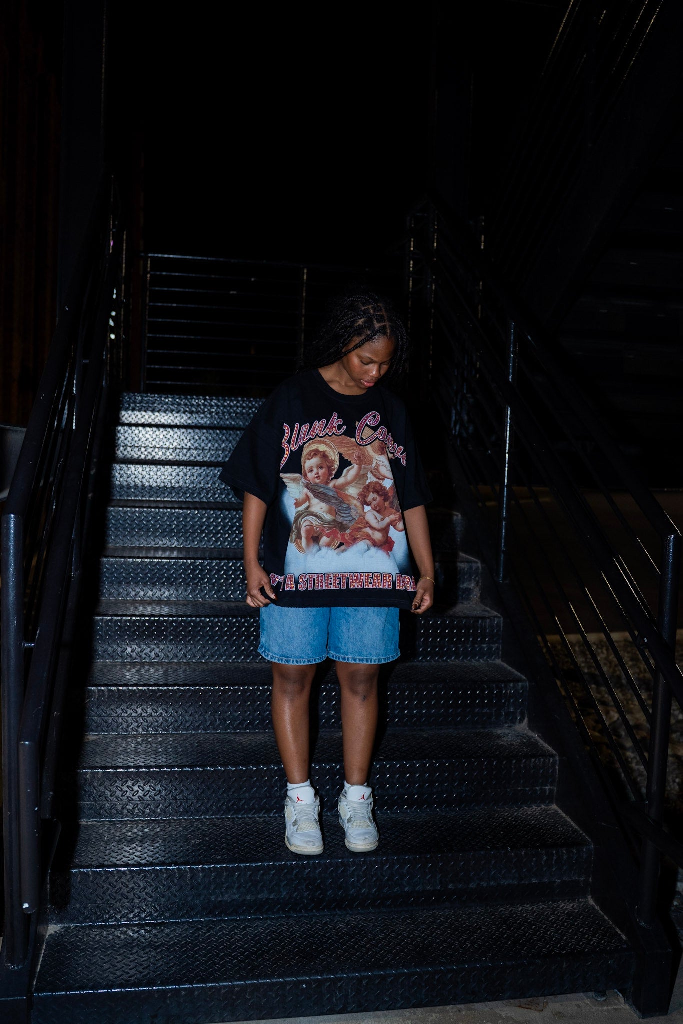The Bl4nk Canvas Tee in black delivers a bold statement that fuses vintage art with raw streetwear energy. Featuring a striking cherub print across the front and standout lettering, this heavyweight cotton tee brings classic renaissance vibes into the modern era. Its oversized fit and soft-washed texture make it a go-to piece for everyday wear and layered looks.